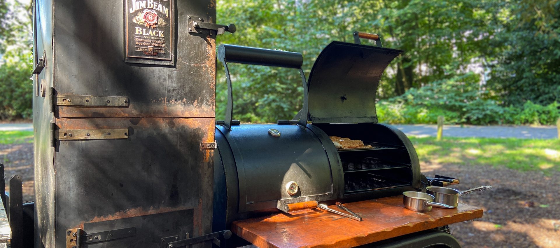 Zelf aan de slag met de Rolls-Royce onder de barbecues: de Oklahoma Joe. Wil jij je barbecue skills verbeteren? Onze chefs leren jou graag alles over barbecueën. Na het volgen van deze masterclass weet jij hoe je het beste de temperatuur kunt beheersen, wanneer de garing juist is en je leert nog veel meer andere tips en tricks. En uiteraard moet dat overheerlijke eten naderhand geproefd worden. Wij barbecueën in het park of onder onze stretchtent, dus ook bij minder weer kan de Oklahoma Joe aan! Je kunt je ook individueel inschrijven voor een van onze BBQ masterclasses.